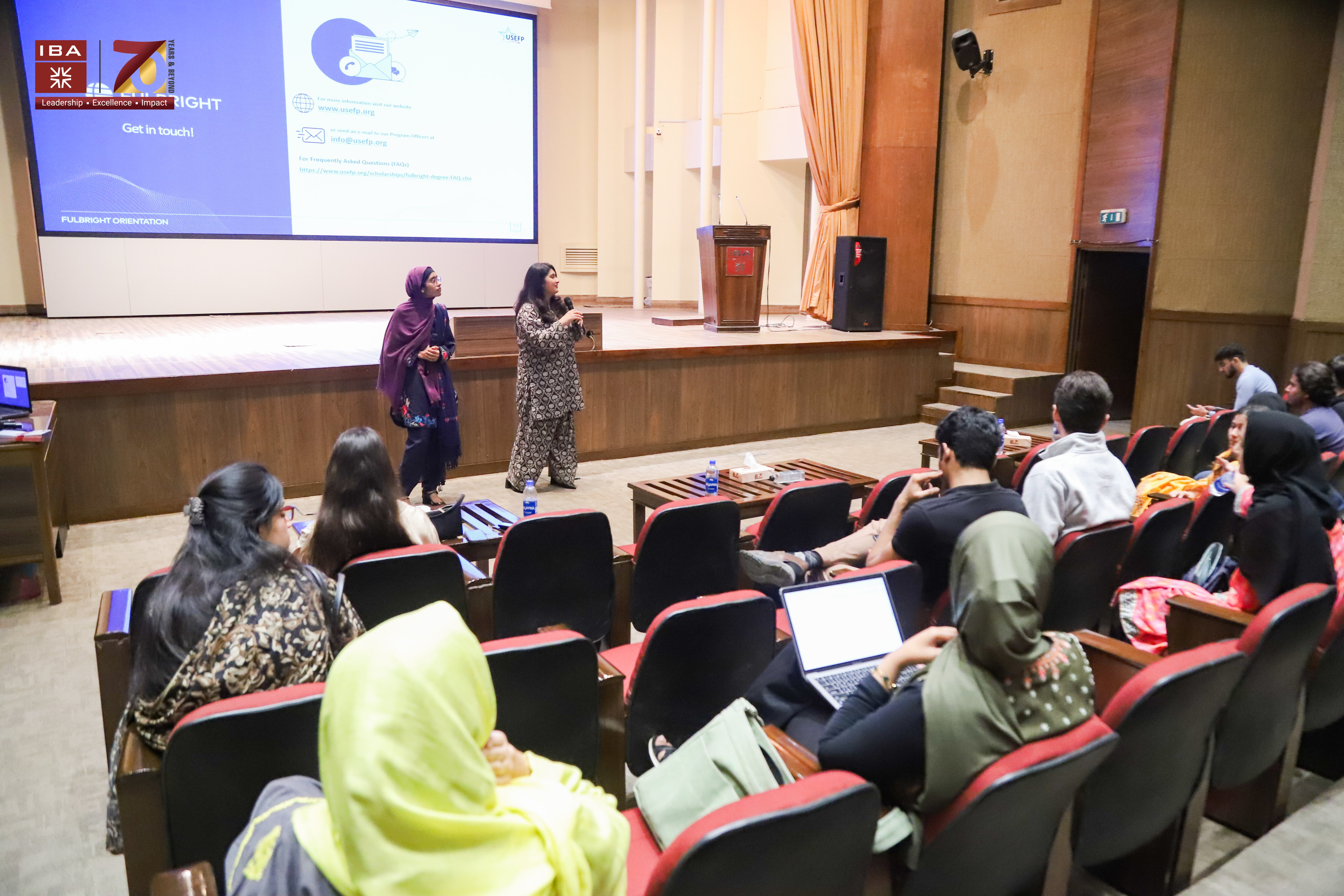 collaboration with USEFP, held a Fulbright scholarship session for students aiming for master’s and PhD studies in the U.S. USEFP’s Mr. Saleem Razaque shared tips on applications, GRE, and personal statements, while alumni Fulbright Scholars Tazmeen Fatima and Abiha Anjum shared their experiences. The session also included discussions with IBA faculty on academic exchange and collaboration opportunities.